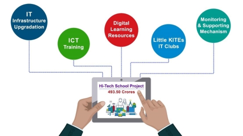 Each Hi-Tech classroom is equipped with Laptop, ceiling mounted Multimedia Projector, HDMI Cables and Faceplates, Whiteboard / Projection Screen, USB Speakers, High Speed Broadband internet and access to Samagra Resrouce Portal. The Hi-Tech IT Labs feature Laptops ,Sound system and Multifunction Printers. In addition to that, each of the 4752 schools are provided with a 42 inch LED TV, Full HD webcam and a DSLR Camera. The IT Labs and Classrooms would be connected via network through a Central server in the Lab, which would allow sharing of information.