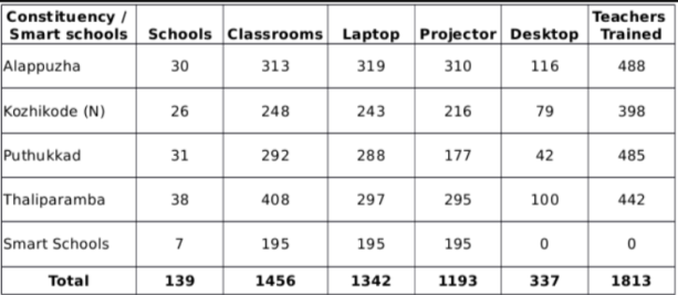 KITE successfully undertook a pilot implementation of Hi-Tech School Programme in 139 selected schools in 4 constituencies – Alappuzha, Puthukkad, Kozhikode North and Thaliparamba and also including the 7 Smart Schools during 2016-2017. The details of the ICT equipment deployed to these schools are as follows;