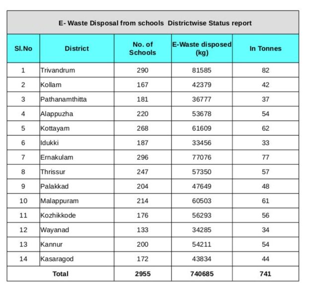 KITE had tied up with Clean Kerala Company of Govt of Kerala dispose over 1 Cr kilograms of e-Waste from over 10,000 schools and educational offices in Kerala. It has been reported that the eWaste which has been accumulated since the past two decades, eats-up huge space of IT labs, besides obstructing the lab activities in a large way. As on date over 750 Tonnes of eWaste has been disposed from 14 districts. Equipments such as Desktop Computers, CRT Monitors, Laptops, Desktop Cabinets, Drives, Printers, Projectors, UPS, Camera, Speaker System, Television, Network Components, Generators etc are being included in the eWaste category.