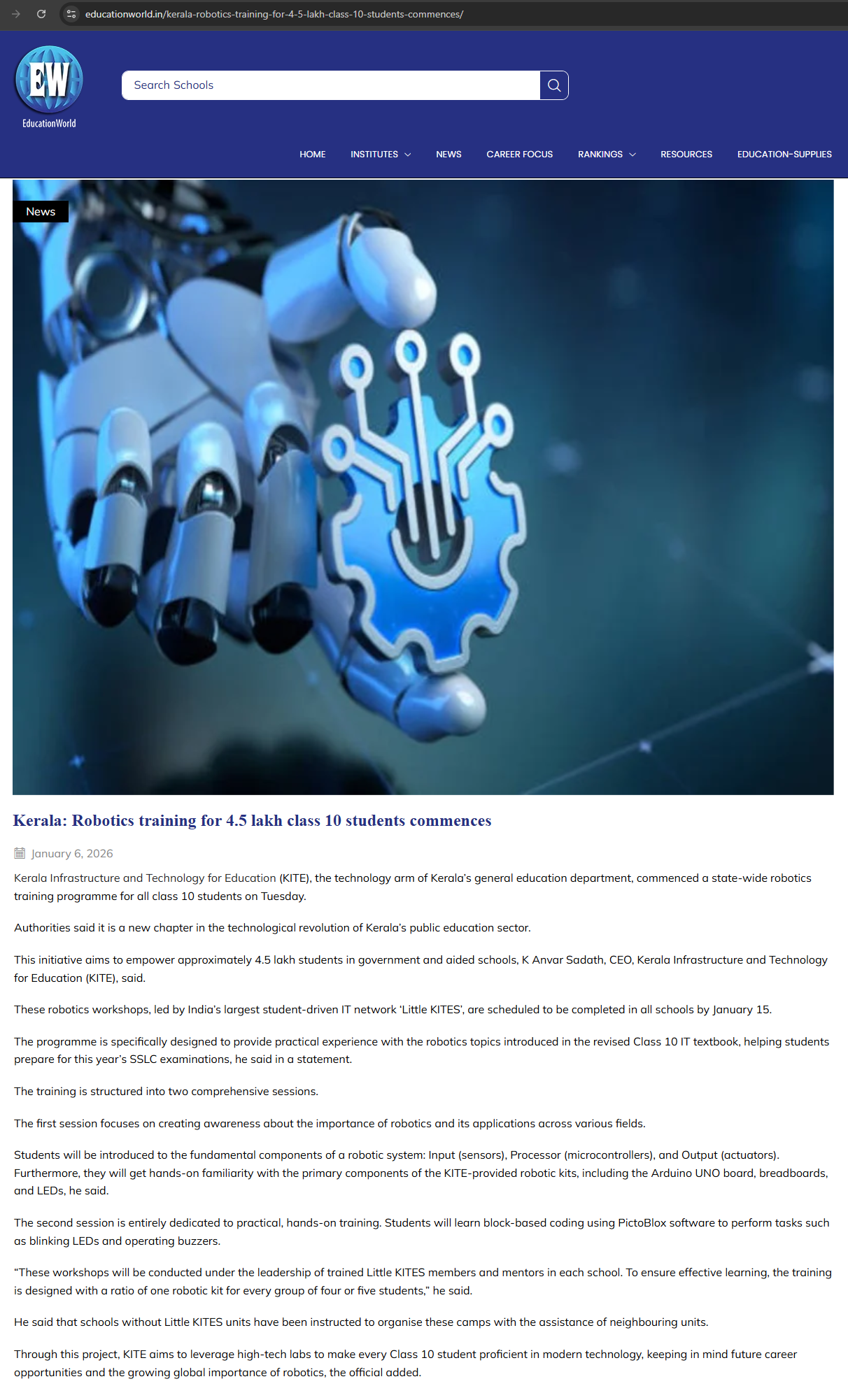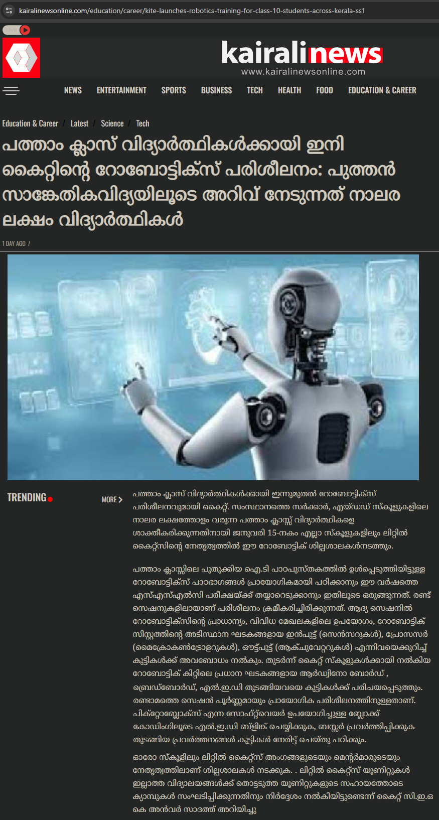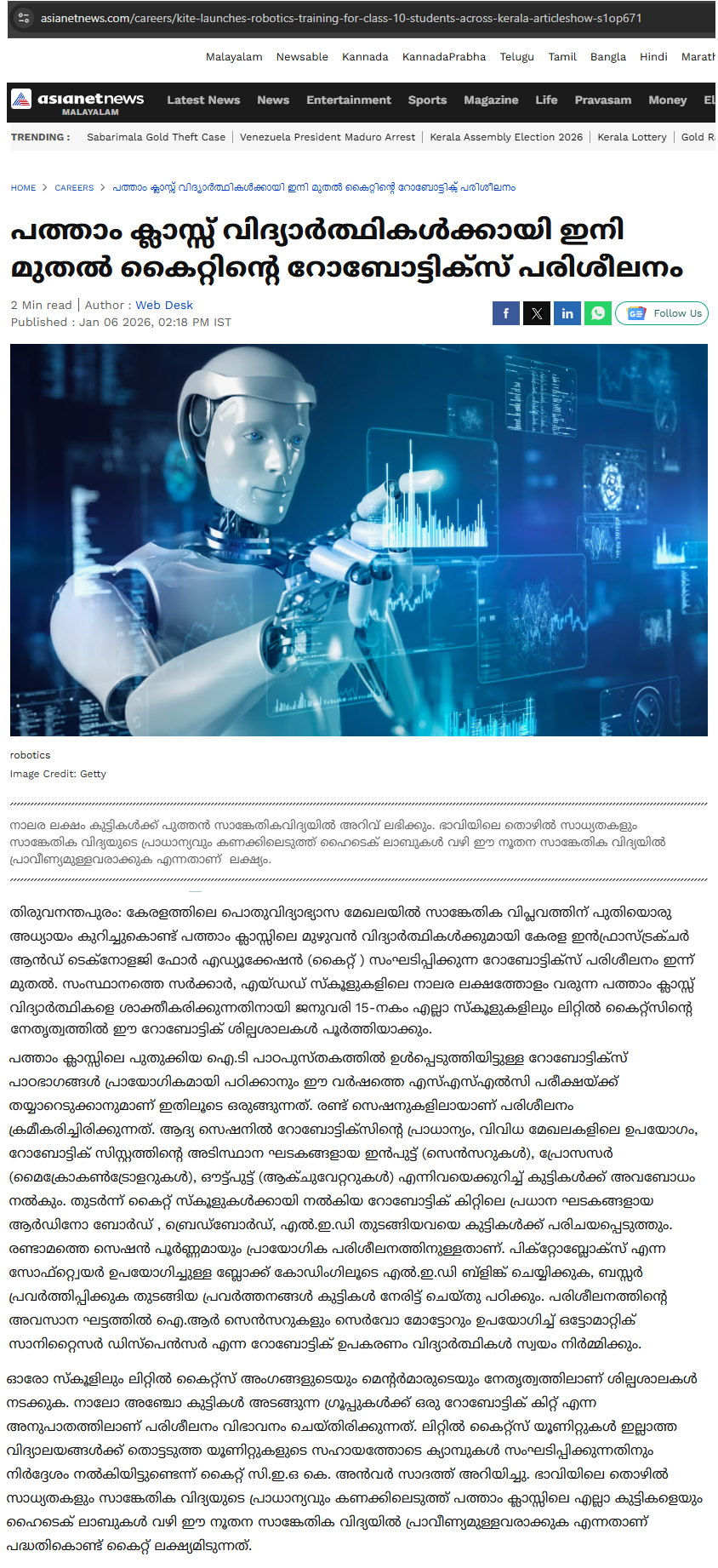 Robotics training for STD 10 - Mathrubhumi 07/01/2026