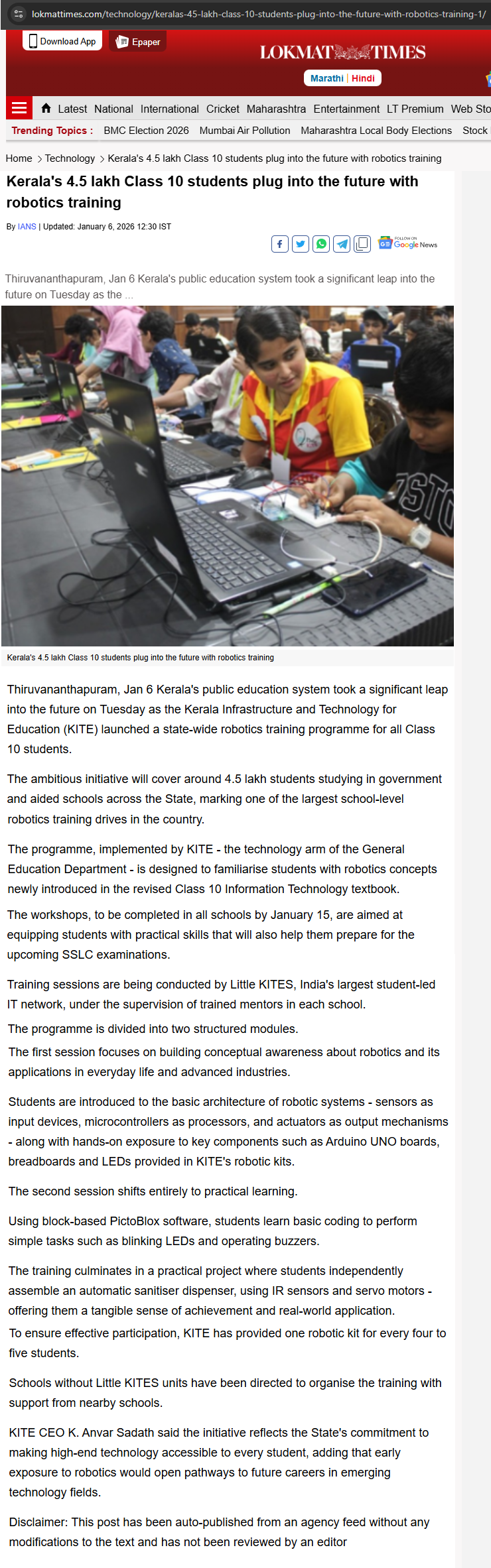 Robotics training for STD 10 - Lokmat Times 06/01/2026