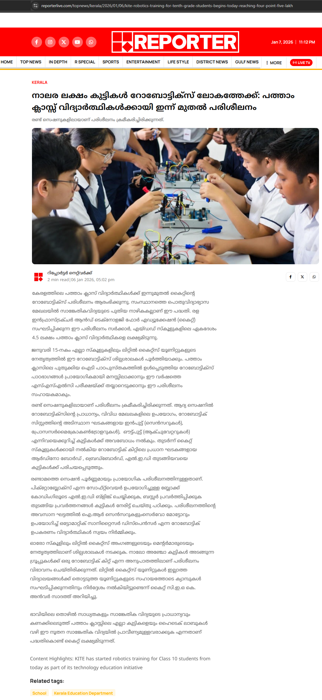 Robotics training for STD 10 - Deshabhimani 07/01/2026