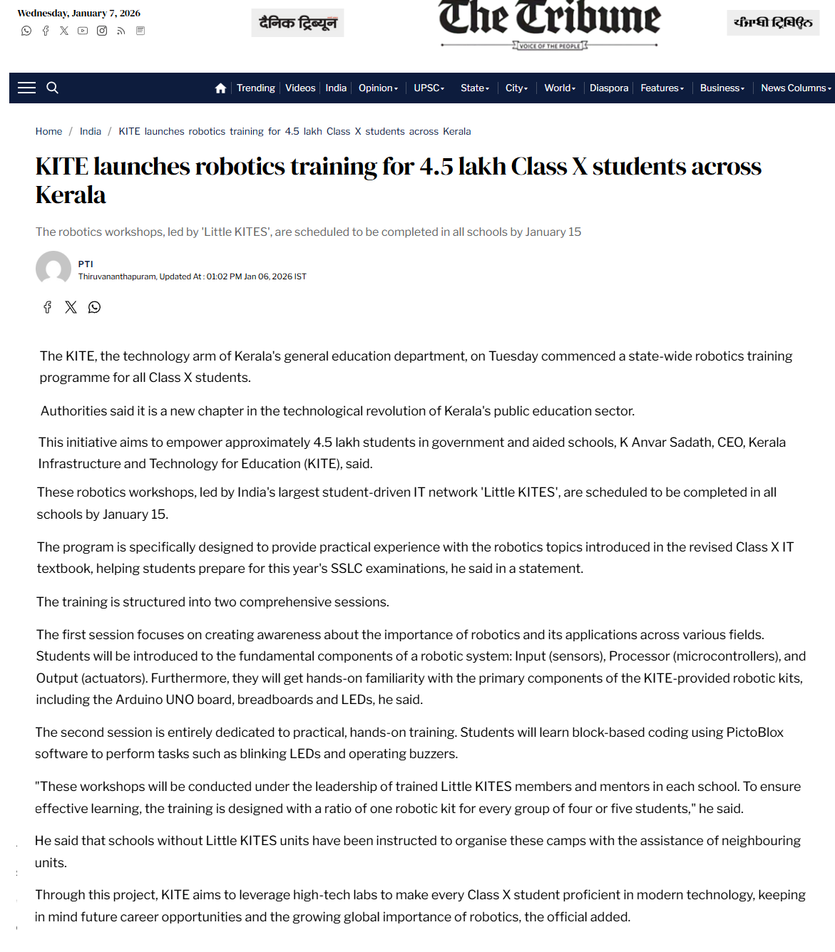 Robotics training for STD 10 - The Tribune 06/01/2026