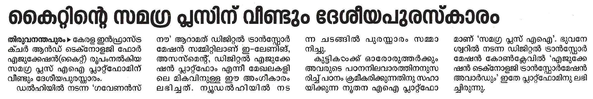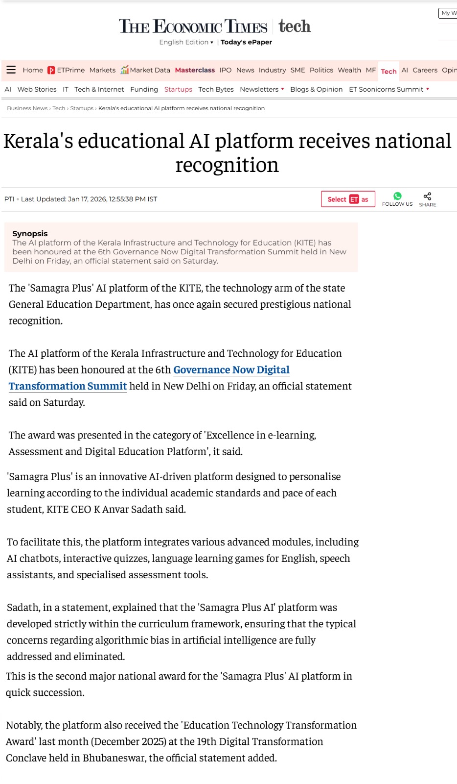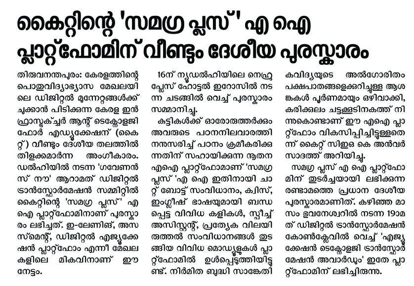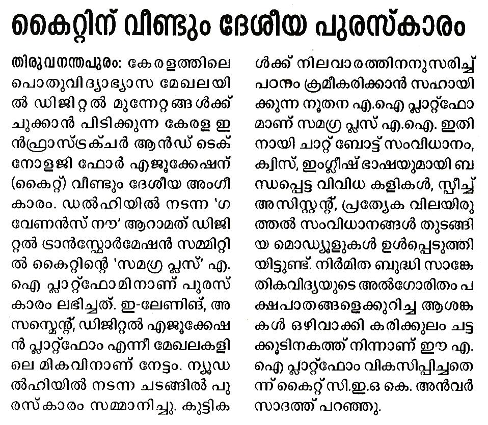 KITE AI platform secures national recognition - Madhyamam 18/01/2026